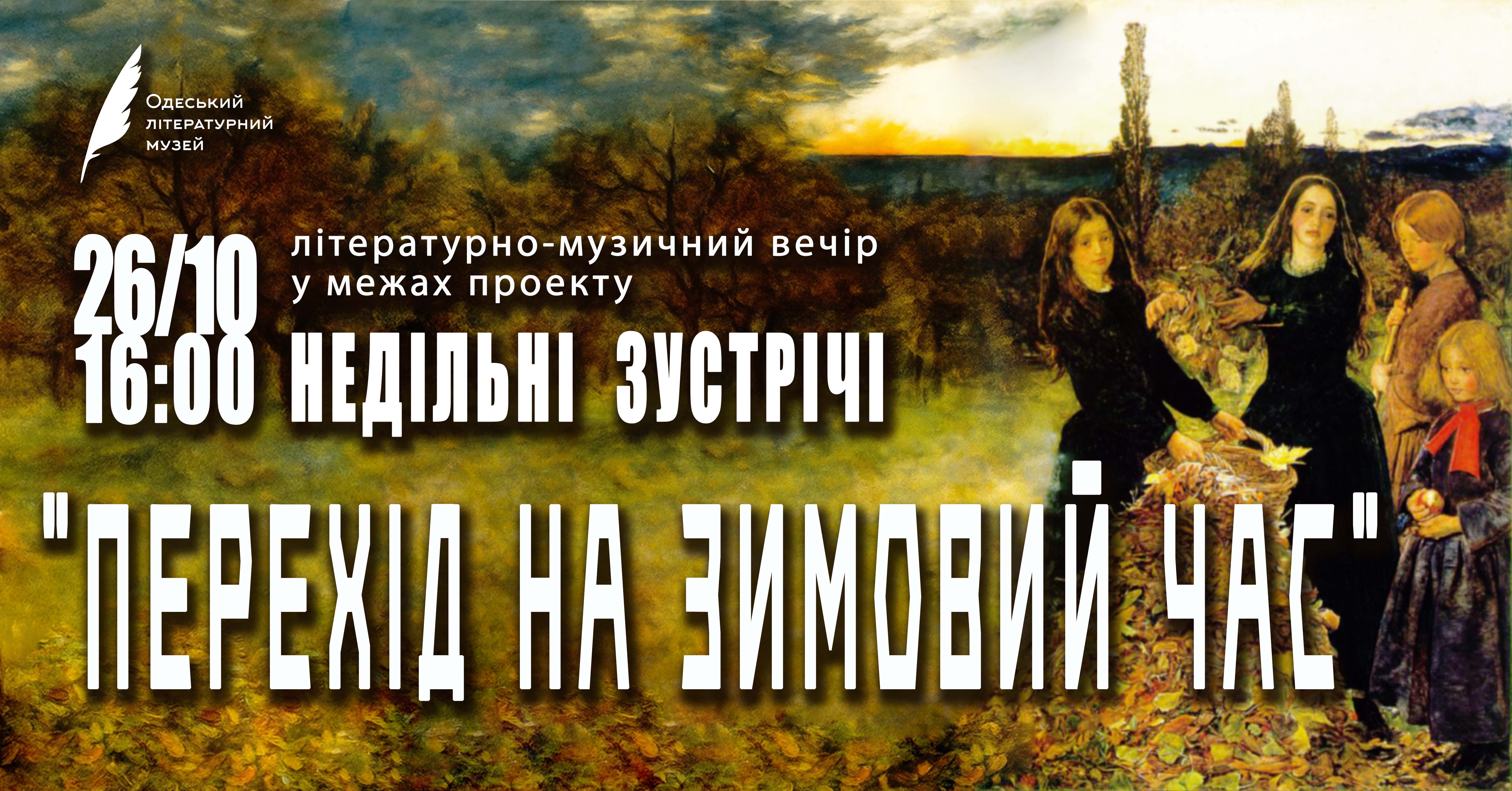 Любі друзі, ми знову запрошуємо вас на наші "Недільні зустрічі". Наш літературно-музичний вечір "Перехід на зимовий час", відбудеться 26 жовтня у галереї Одеського Літературного музею о 16:00. Назва нашого заходу говорить про глибоку осінь та одночасно нагадує, що саме сьогодні потрібно перевести стрілки годинника на годину назад. Ми майже робимо невелику мандрівку у часі - трохи переводимо годинник у минуле. І насамперед наш вечір присвячується осені: її розкішному вбранню, її тиші та спокою на тлі вибухів та сигналів повтряної…