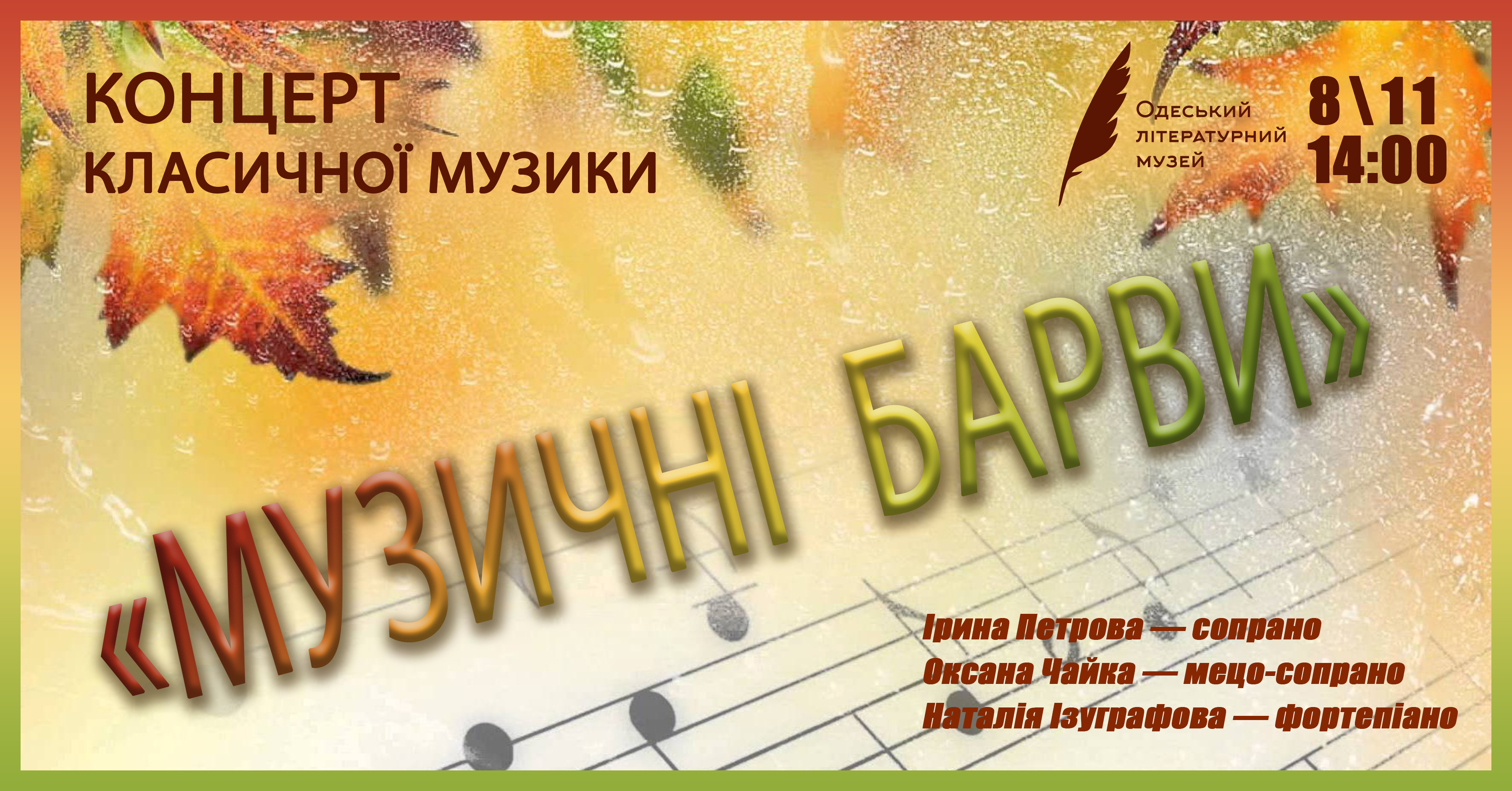 8 листопада о 14:00 у Золотій залі Одеського літературного музею (вул. Ланжеронівська, 2) відбудеться концерт класичної музики «Музичні барви» — подія, що поєднує витонченість академічного вокалу та фортепіанного мистецтва. У програмі — твори світової класики та українських композиторів у виконанні талановитих музикантів: Ірини Петрової (сопрано), Оксани Чайки (мецо-сопрано), Наталії Ізуграфової (фортепіано). Концерт створить атмосферу осіннього натхнення — гармонії, світла й теплих емоцій.Запрошуємо шанувальників музики поринути у світ краси, де кожен акорд стає кольором, а кожен голос — відтінком почуттів. 📍…