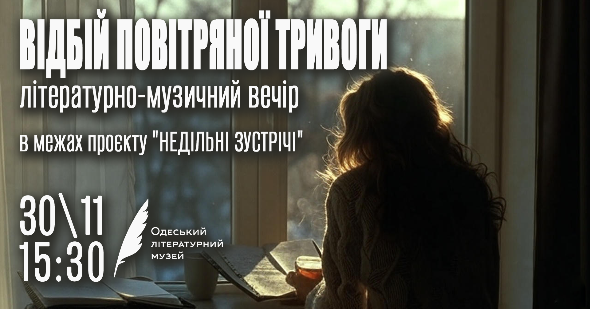 Любі друзі, "Недільні зустрічі" знову чекають на вас! 30 листопада о 15:30 у галереї Літературного музею відбудеться літературно-музичний вечір "Відбій повітряної тривоги". Ми всі знаходимося у стані постійної напруги, довготривалого стресу. Повітряні тривоги у нашому житті - це річ постійна, але звикнутися з ними неможливо. І коли наступає відбій повітряної тривоги, ми трохи розслабляємось. Тут, звісно, не маються на увазі випадки, коли в чийсь будинок прилетіло і чиїсь близькі загинули. Трохи відступає напруга, і ми повертаємось до своїх звичайних діл:…