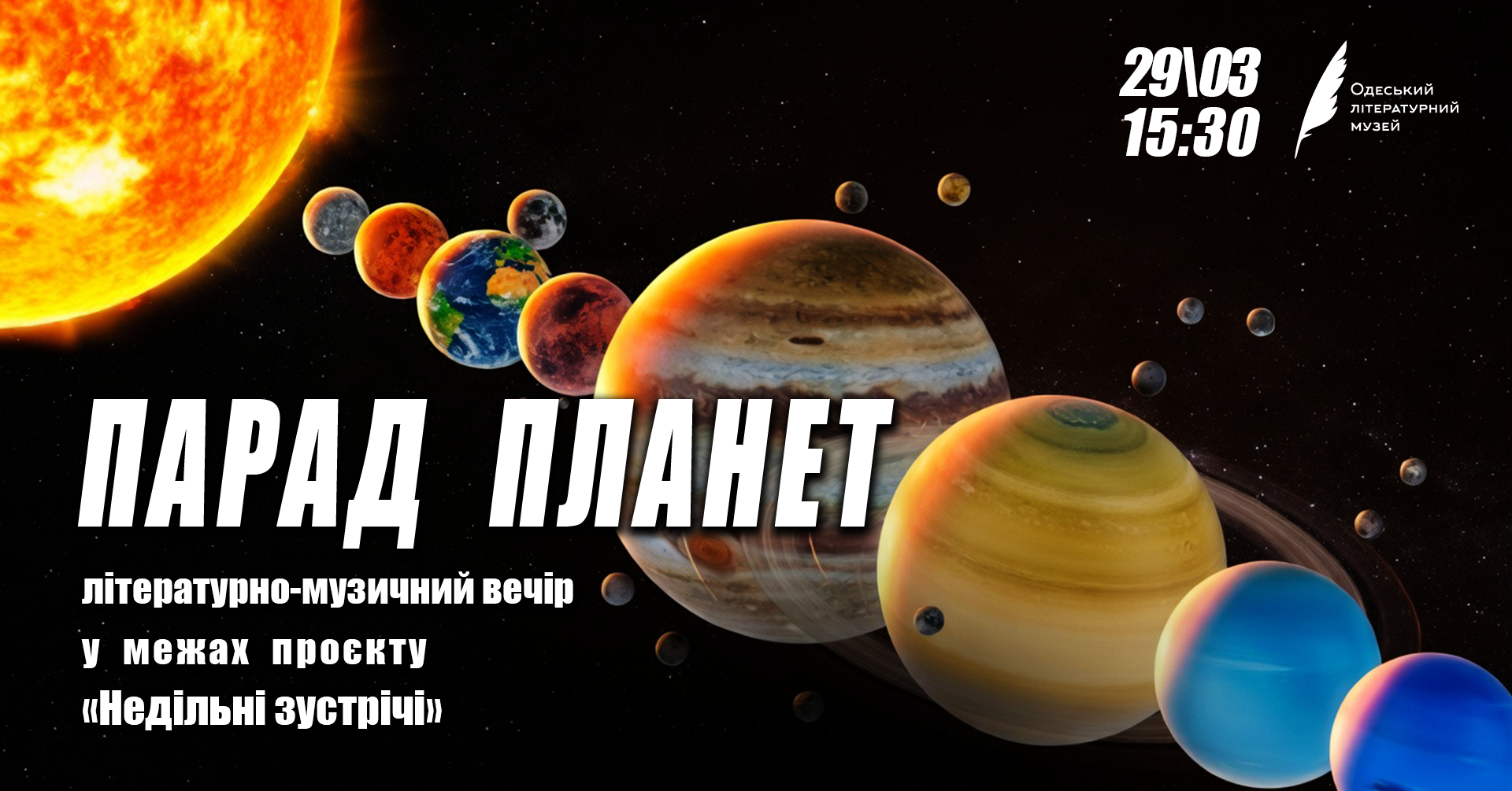 Світова поезія живе поруч із вами. Достатньо подивитись на небо, щоб побачити: ось вони! Кожен обертається на своїй унікальній орбіті. Але іноді — вкрай нечасто — вони шикуються, немов на параді. Тож… Наприкінці свят до Дня Поезії в нашому музеї Парад Планет! Жодна з них не схожа на інші, кожна заселена високорозвиненими поетичними формами життя. Назви цих планет: Ігор Божко Марія Галіна Майя Дімерлі Денис Дмітрієв Владислава Ільїнська Євгенія Красноярова Анна Маліцька Даниїл Попов (Данко Пташиний) Михайло Сон Анна Стремінська…