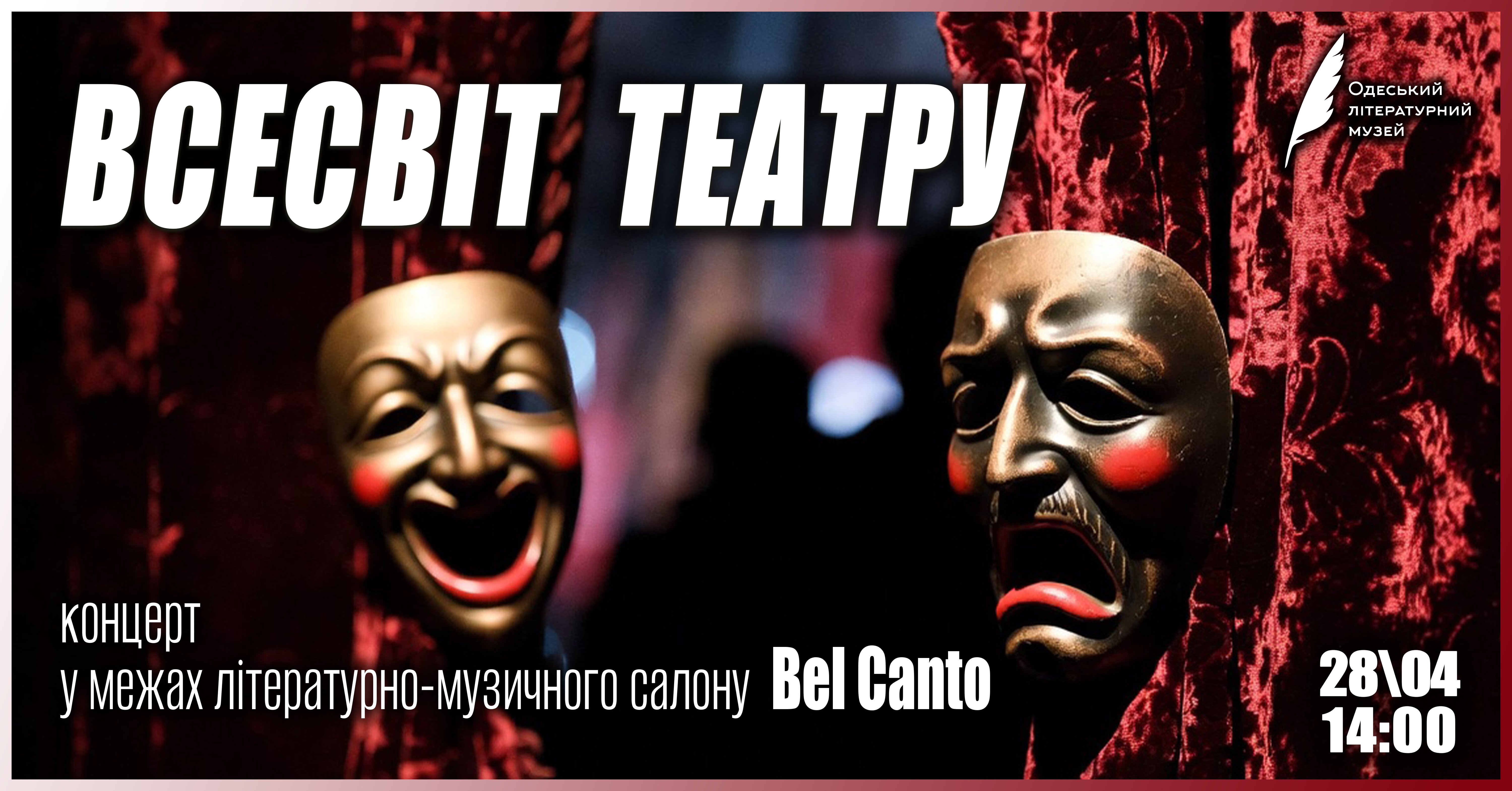 🎭 «ВСЕСВІТ ТЕАТРУ» — концерт до Міжнародного дня театру в Одеському літературному музеї На вас чекає святковий концерт, присвячений Міжнародному дню театру 🎭 🤝 Подія є спільним проєктом Одеського літературного музею (музично-літературний проєкт «Bel Canto») та Одеського муніципального музичного театру ім. Народного артиста України О. Саліка. 💫 У програмі — яскраве поєднання вокального мистецтва та театральної емоції у виконанні провідних українських і міжнародних артистів. 🌟 Участь у концерті беруть: ∙ світова зірка, солістка світових оперних театрів Ханна Шафажинська; ∙…