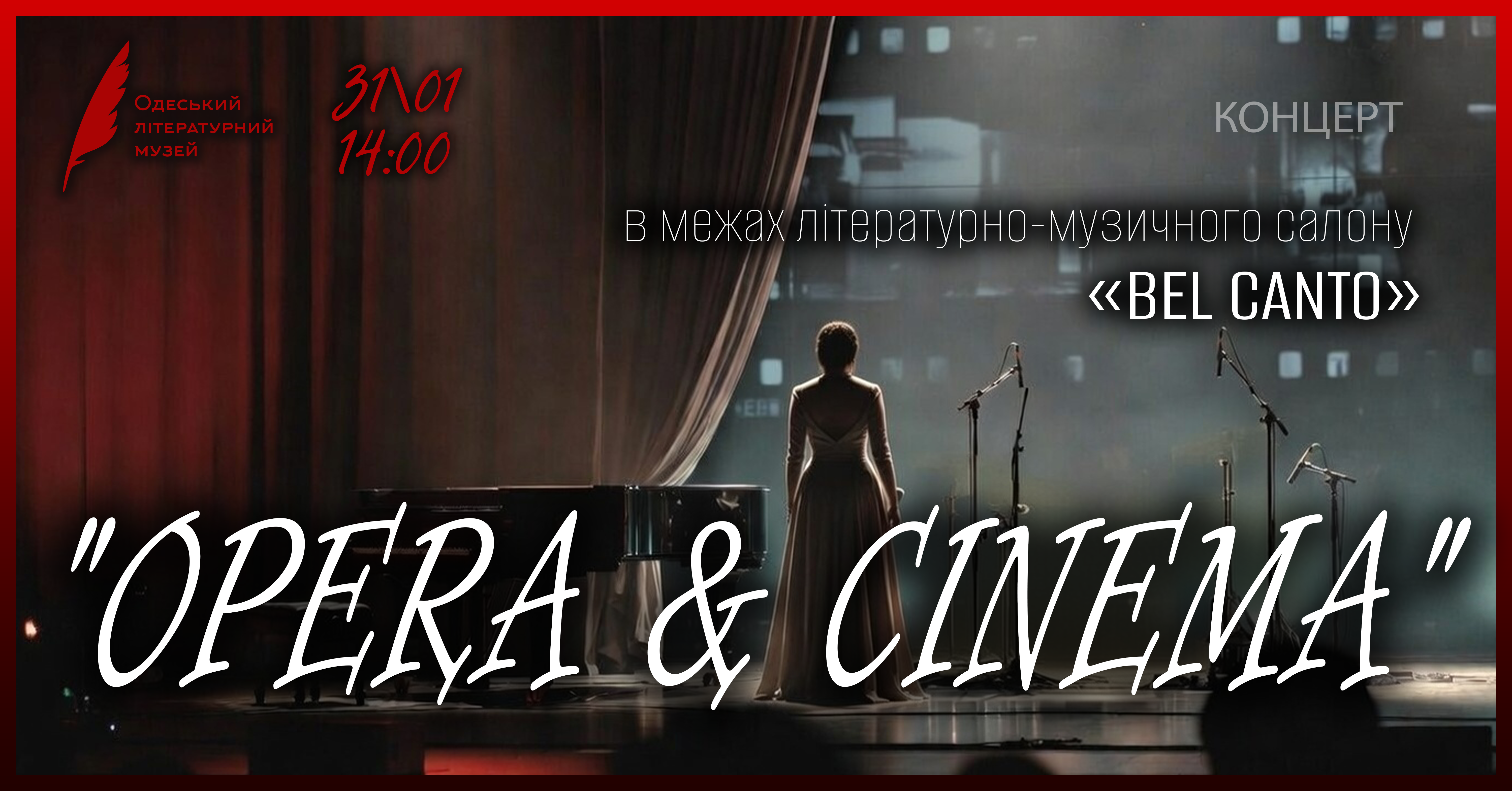 31 січня о 14:00 в Одеському літературному музеї відбудеться концертна програма «OPERA & CINEMA» — музичний проєкт літературно-музичного салону BEL CANTO, що об’єднає світ опери та культові сторінки кінематографа.