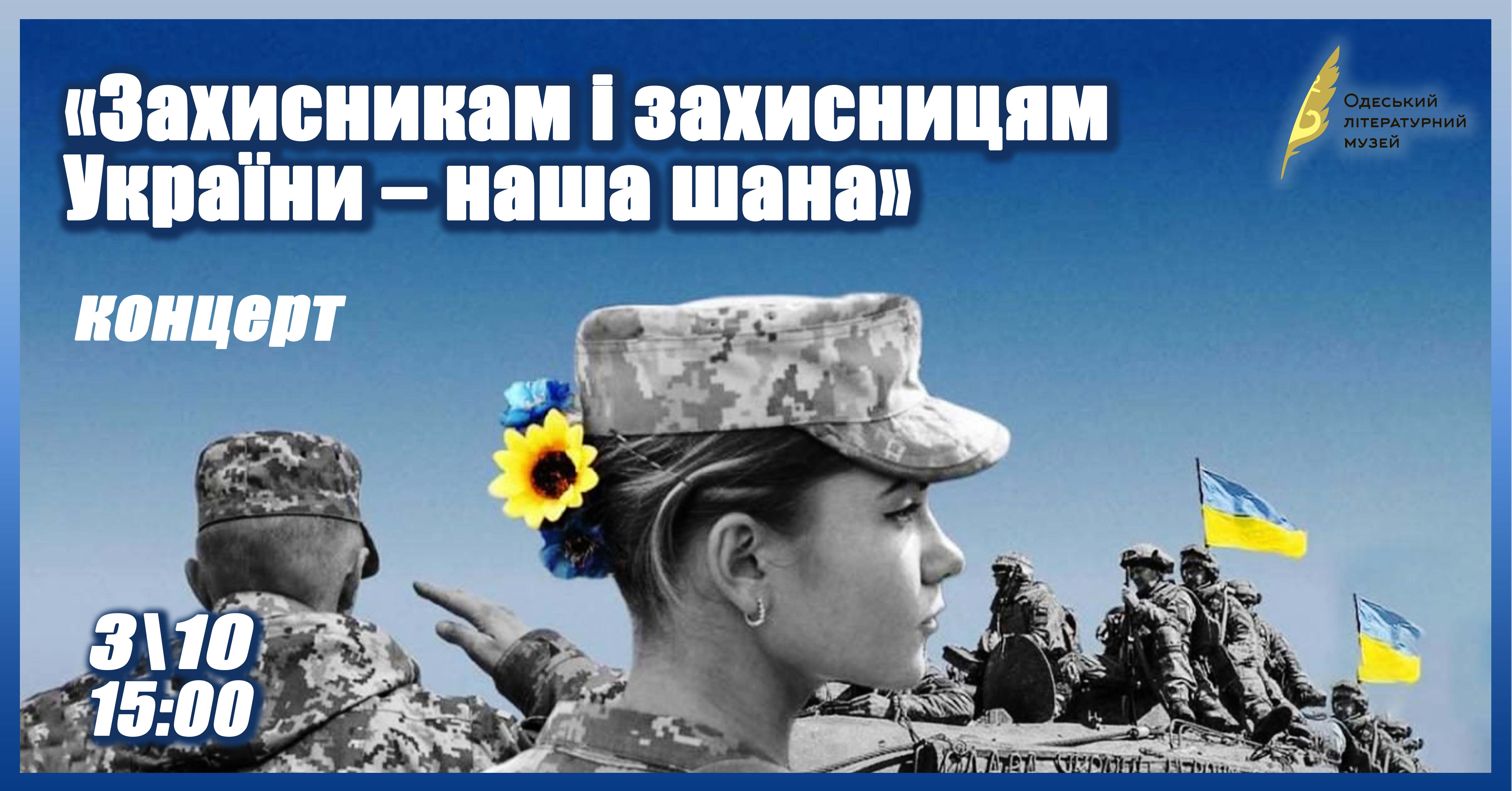 В Одеському літературному музеї, у Золотій залі, відбудеться урочистий концерт «Захисникам і захисницям України – наша шана». Початок заходу – о 15:00.